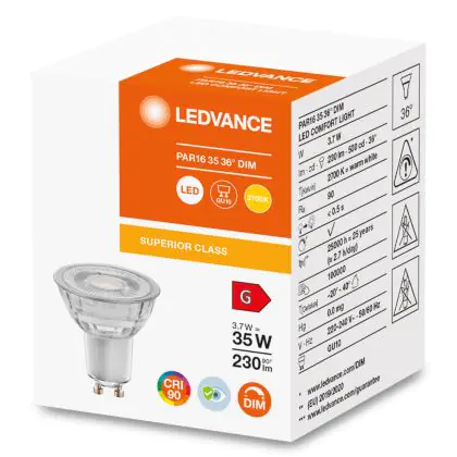 Descrizione Ledvance Superior Riflettore LED GU10 Spot Chiara 3.7W 230lm - 927 Bianco Molto Caldo | Dimmerabile - Miglior resa cromatica