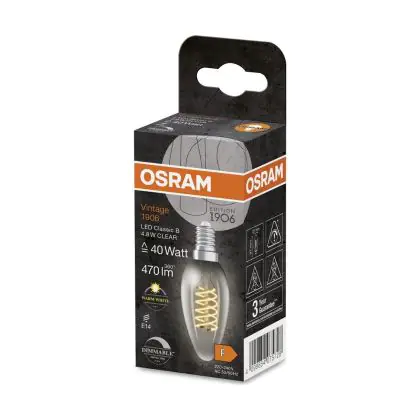 La Osram Vintage 1906 LED Classic Slim E14 Candela Filamento Chiara 4.8W 470lm - 827 Bianco Molto Caldo | Dimmerabile - Sostitutiva 40W è la perfetta sostituzione per la tua lampada convenzionale 40W con attacco E27 grazie alla sua tecnologia LED. Passare a LED ti offrirà tanti vantaggi!