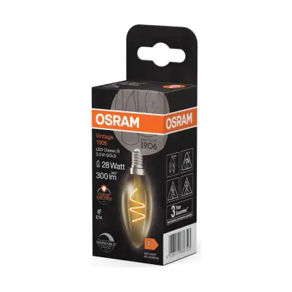 La lampada Osram Vintage 1906 LED Classic Slim E14 Candela Filamento Oro 3.5W 300lm - 922 Bianco Molto Caldo | Miglior Resa Cromatica - Dimmerabile - Sostitutiva 25W è il sostituto perfetto per le tue vecchie lampade 25W con attacco a vite piccolo E14 grazie alla sua tecnologia LED. Passare a LED ti offrirà molti vantaggi!