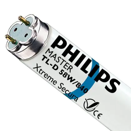 I Philips TL-D Xtreme Secura 58W 840 - 150cm (MASTER)sono tubi fluorescenti che presentano una struttura protettiva che evita il disperdersi delle componenti della lampada in caso di rottura accidentale. Questi tubi sono dotati di una potenza di 58W e di attacco G13. La lunghezza degli stessi é di 150cm. La loro vita si colloca intorno alle 79.000 ore in media e l'indice di resa cromatica assume un valore tra 80-89Ra. La luce emessa da tali tubi é una luce bianca fredda, il che corrisponde ad una temperatura di colore di 4000K.