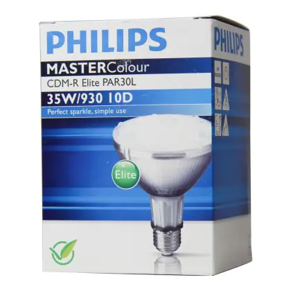 Le Philips CDM-R Elite 35W 930 E27 PAR30L 10D (MASTERColour) sono lampade a scarica compatte ad alogenuri metallici in ceramica dotate di riflettore. Queste lampade, note per la loro elevata efficienza, hanno una potenza pari a 35W e presentano un attacco del tipo E27. Presentano una vita media pari a 15.000 ore. L'indice di resa cromatica delle Philips CDM-R Elite 35W 930 E27 PAR30L 10D (MASTERColour) si assesta nell'intervallo di 90-100Ra: questo indica che i colori e le caratteristiche degli oggetti illuminati vengono esaltati incredibilmente.