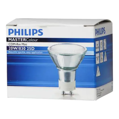 Le Philips CDM-R Mini 20W 830 GX10 MR16 25D (MASTERColour) sono lampade a scarica compatte che offrono un'illuminazione di elevata qualità con un'ottima stabilità del colore. Queste lampade hanno una potenza pari 20W e presentano una base del tipo GX10 . La vita media di questi articoli é pari a 15.000 ore. L'indice di resa cromatica si colloca nell'intervallo di 80-89Ra, a testimonianza dell'elevata resa dei colori. Importante inoltre sottolineare l'efficienza energetica di queste lampade a scarica: esse offrono un risparmio energetico fino al 60% rispetto alle lampade alogene a bassa tensione.