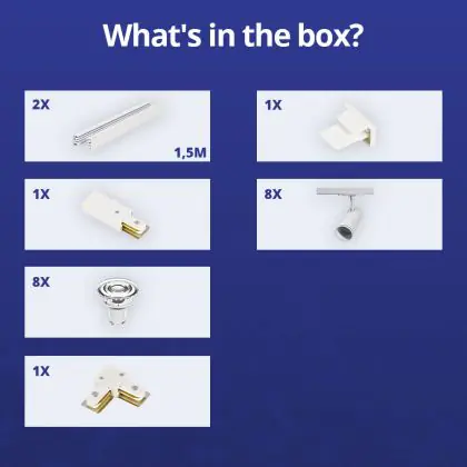 | Nome del fabbricante | Complete L shaped 1-Phase Track Set White incl. 8x Spot fixture + GU10 2700K 3W Dim – 1.5 x 1.5 mete | |